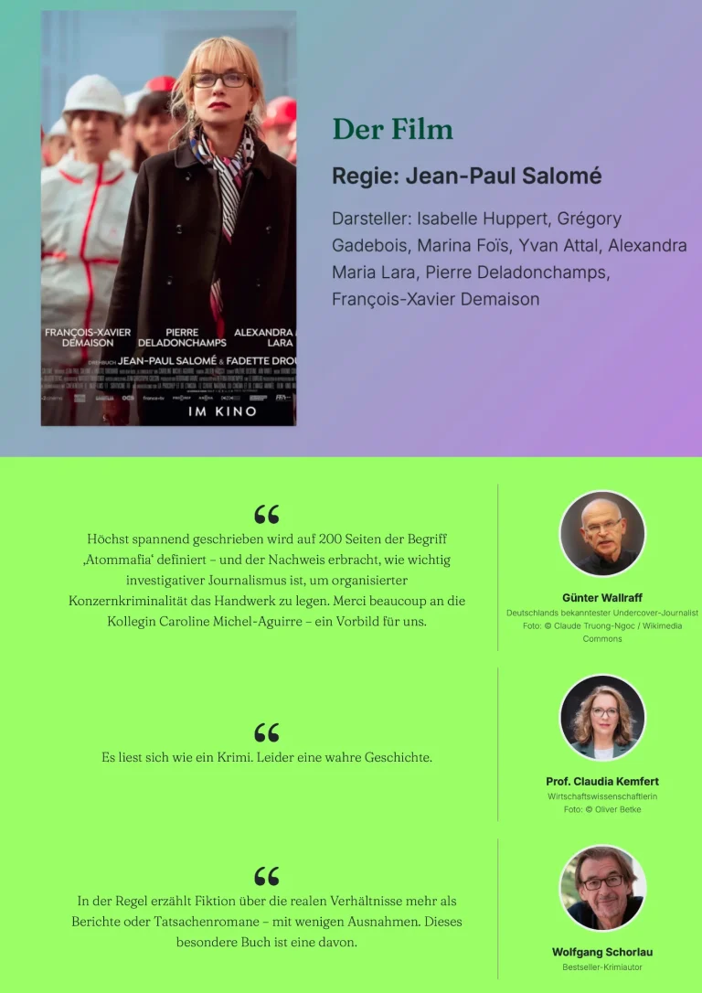 Im Anschluss an die Vorführung haben Sie die Gelegenheit, mit Dr. Eva Stegen ins Gespräch zu kommen – der Übersetzerin des Buches Die Gewerkschafterin, das Caroline Michel-Aguirre über den Fall und ihre Recherchen geschrieben hat. Durch zahlreiche persönliche Begegnungen mit ihr und „der Gewerkschafterin“ Maureen Kearney kennt Eva Stegen die Hintergründe und Faktenlage aus erster Hand. Zudem ist sie mit der atomwirtschaftlichen Gemengelage bestens vertraut, so dass sie die Zusammenhänge, die bis in die Gegenwart und bis nach Baden-Württemberg reichen, aufzeigen kann.